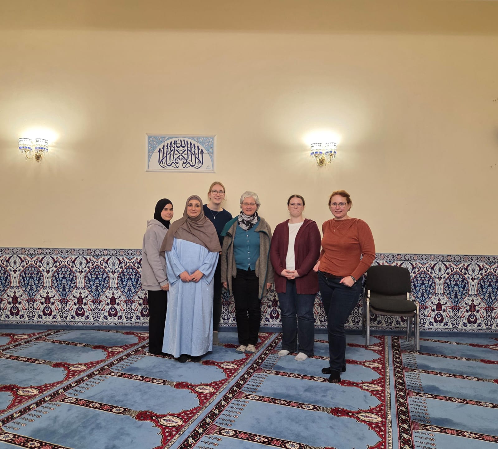 Unsere Führung begann im Unterrichtsraum im oberen Stockwerk. Dort erzählten wir zunächst ein wenig über die Entstehungsgeschichte der Moschee sowie über uns selbst. Anschließend führten wir sie in den Frauenbereich. Die Kinder stürmten förmlich hinein, neugierig und voller Entdeckungsdrang. Sie tobten umher, betrachteten jeden Winkel, staunten über den prachtvollen Kronleuchter – der wurde schnell zum Lieblingsobjekt vieler.